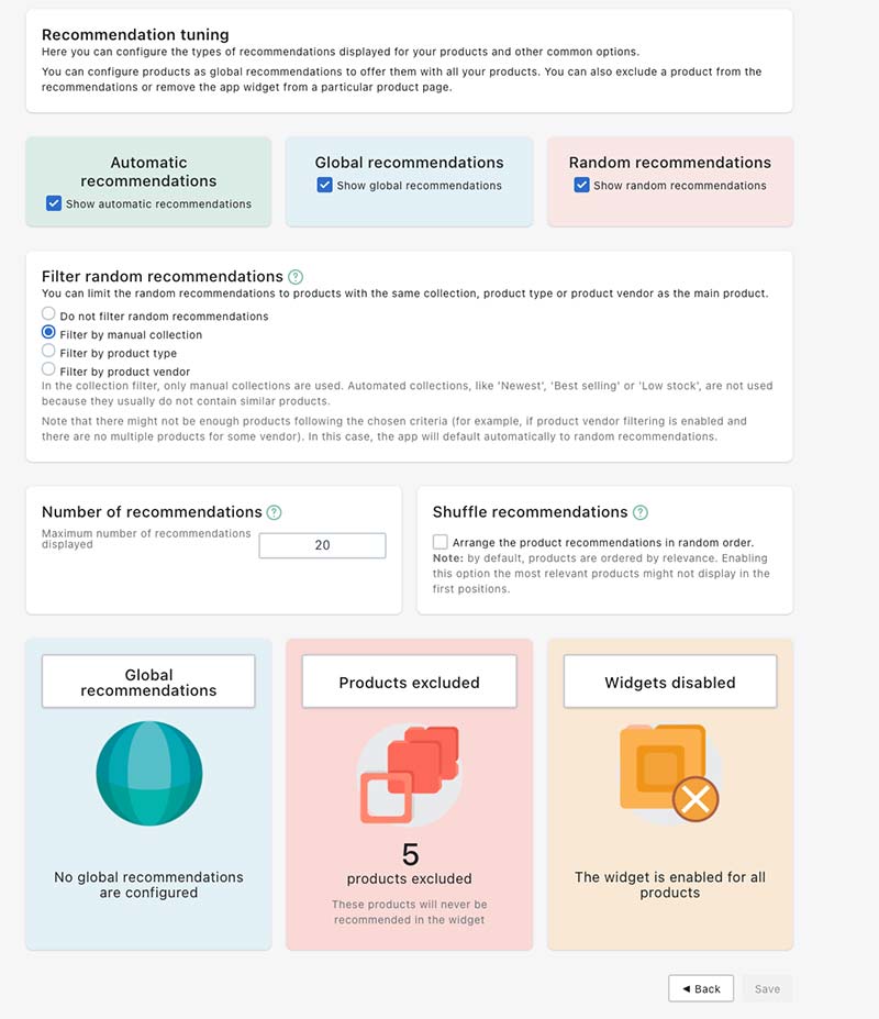 Shuffle recommendationsのオプションをONにすると、レコメンドの標準をシャッフルすることができます。つまり、一番関連性の高い商品が必ずしも一番最初に出さないようにして、新鮮さを保つことができる、とのことです。