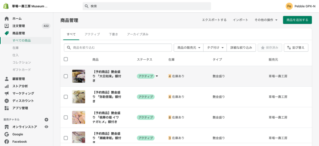 商品名、ステータス(アクティブ、下書き)、在庫、タイプ(商品タイプ)、販売元 が表示されています。