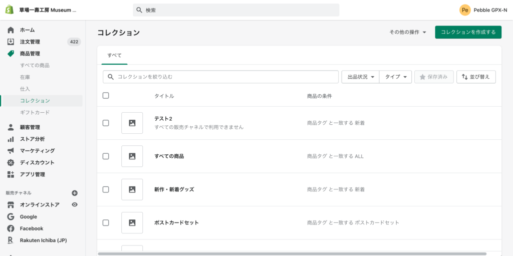 「コレクションを絞り込む」機能のほか、出品状況(販売チャネルでの状況)、タイプ、並び替え が可能です。