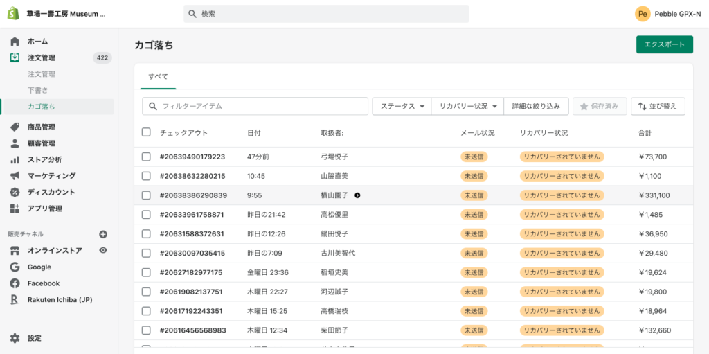顧客のカート上に商品が残っている場合、こちらに情報が掲載されます。購入に結びつけるように、リカバリーメールを送ることができます(カゴ落ちメール)。