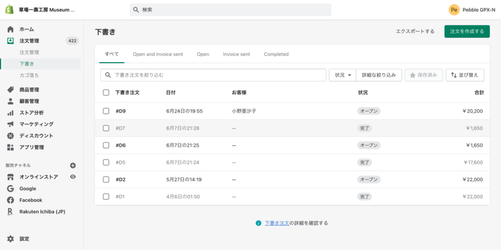 注文を作成した際、下書き状態の場合は、こちらに表示されます。