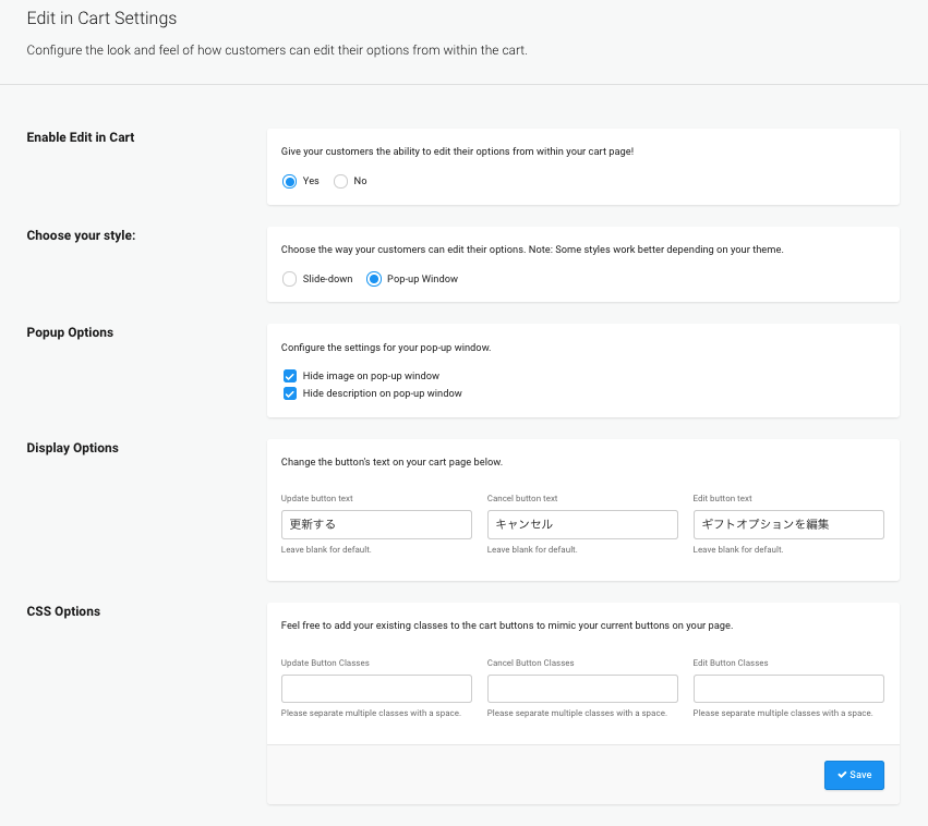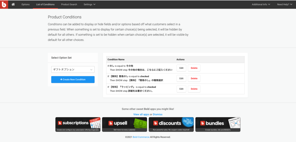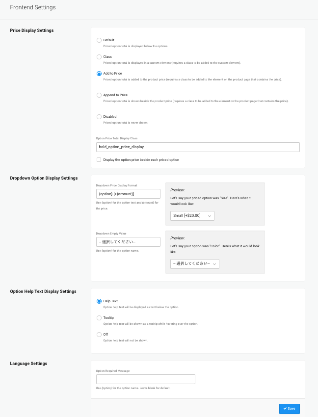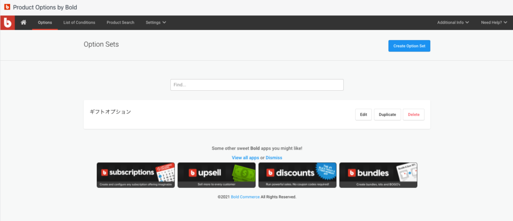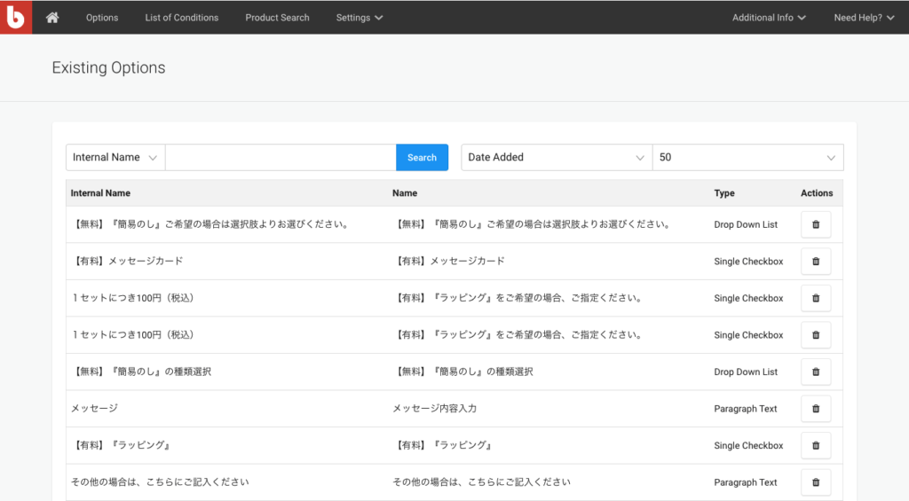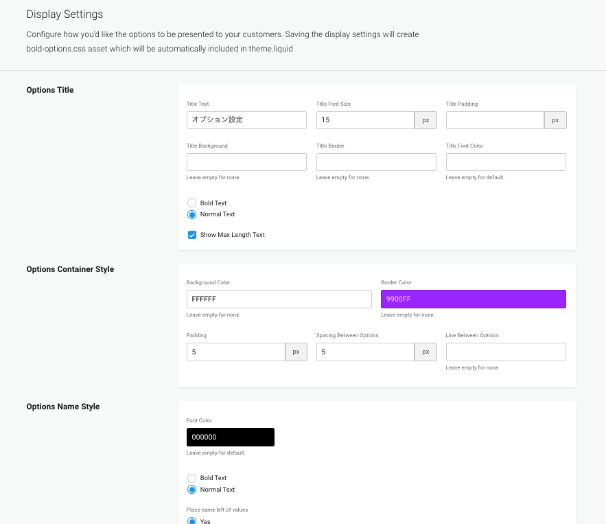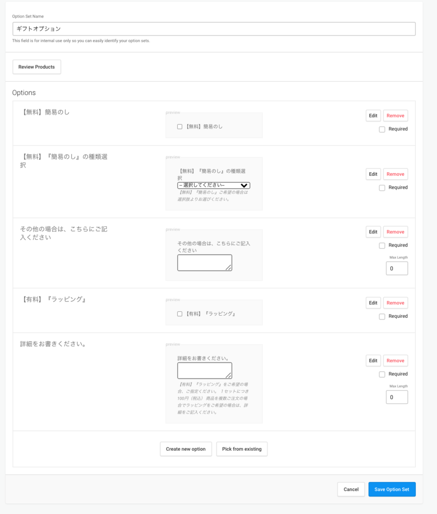 商品名を入れると、設定しているオプションの内容が表示されます。