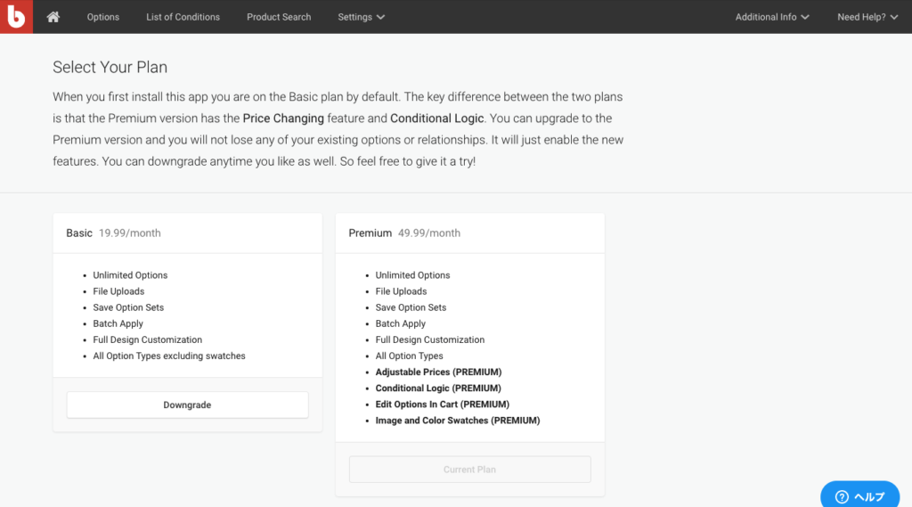 Shopifyストアの商品ページ(product page)に、さまざまなオプションを追加できるアプリです。ユーザーは、商品をページ内でカスタマイズしたり、設定条件に合わせた幅広いオプション選択をしたりすることが可能です。