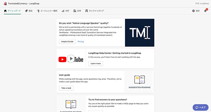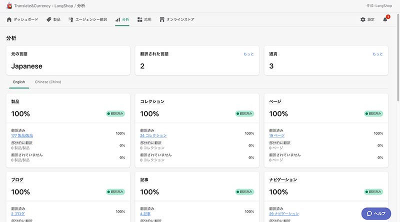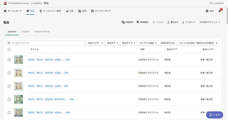・製品 →メニューの製品タブにリンクされています。商品の翻訳状況の確認、反映を行えます。