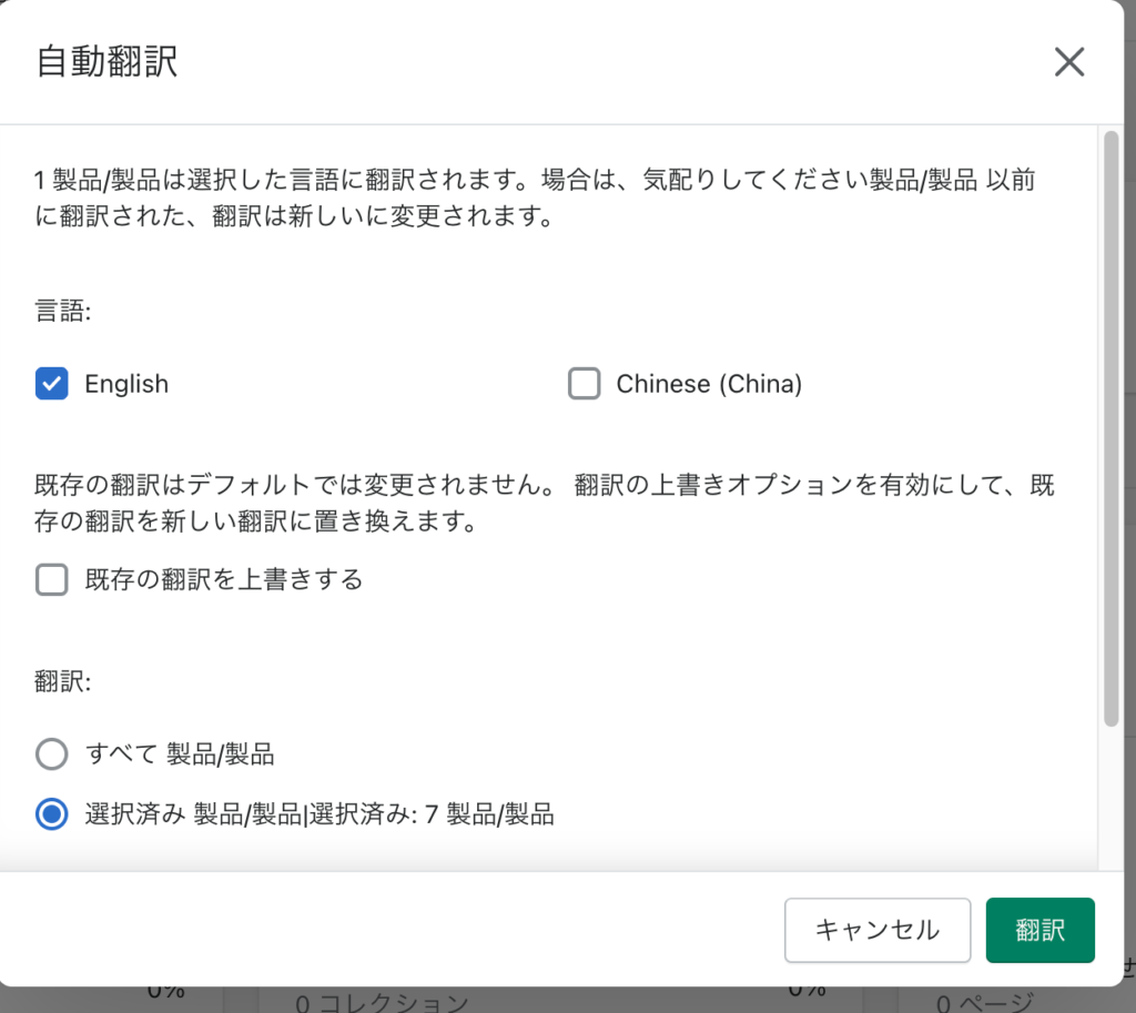 「既存の翻訳を上書きする」をチェックしてしまうと、現状反映されている翻訳内容もリセットされてしまいます。こちらは選ばないようにしてください。