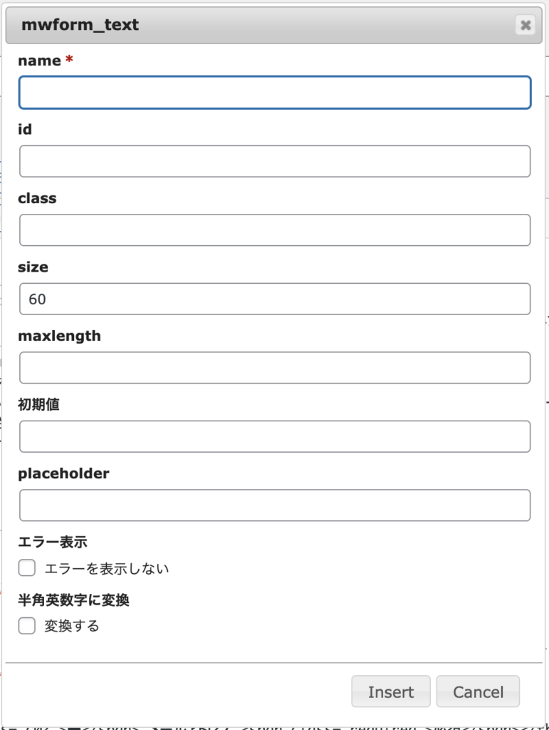 「フォームタグを追加」ボタン左側のセレクトボックスから挿入したい入力形式を選択し、「フォームタグを追加」ボタンを選択すると、以下のような入力欄が表示されます。「エラー表示」と「半角英数に変換」は未選択のままでも問題ございませんが、その他の項目は必要に応じて入力したあと、「Insert」ボタンを選択してください。