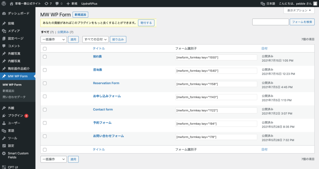 画面左側のメニューから「MW WP Form」を選択すると作成済みのフォーム一覧が表示されます。