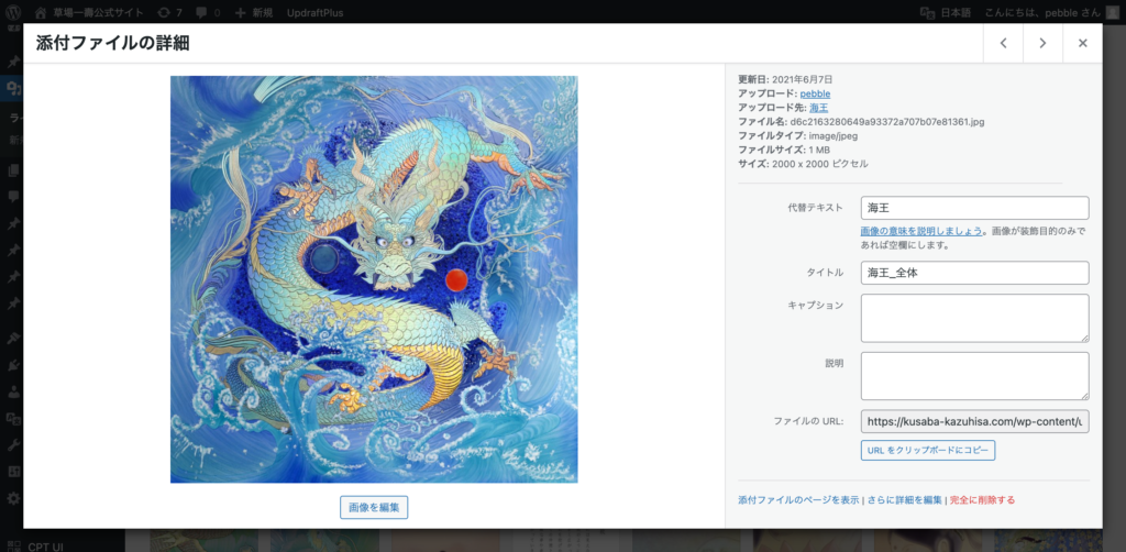 | タイトル | アップロードした画像名が自動で入力されます。 管理画面上だけの情報として、サイト側には表示されませんので、 そのままの内容でも問題ございません。 |