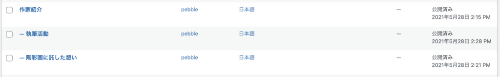 当サイトでは例として「作家紹介」を親ページとして、子ページに「陶彩画に託した思い」「執筆活動」を設定しております。親子関係がある場合、固定ページ一覧でも以下のように表示されます。