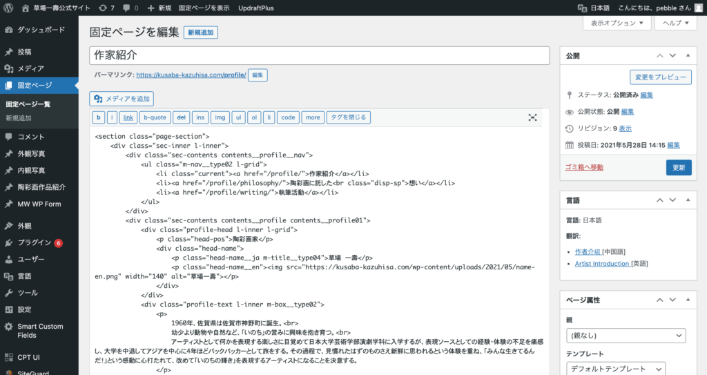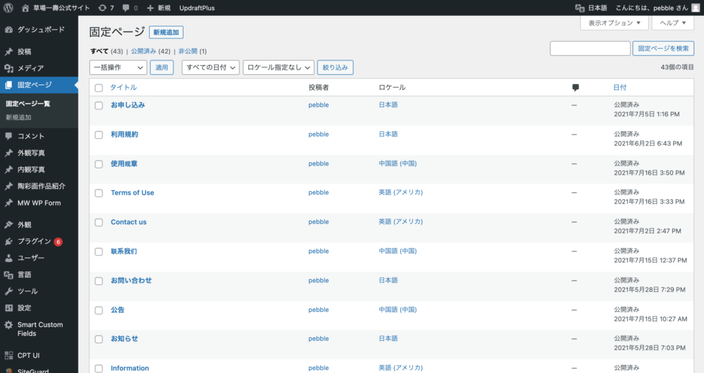 画面左側のメニューから「固定ページ」を選択すると、トップページや作家紹介ページなどの固定ページ一覧が表示されます。基本的な操作はお知らせと同様ですの、お知らせについての説明記事もご参照ください。