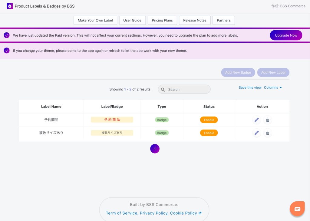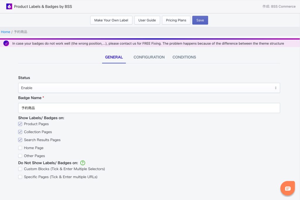 ・Show Labels/ Badges on: ラベルやバッジをどのページで表示するか、チェックを入れる。